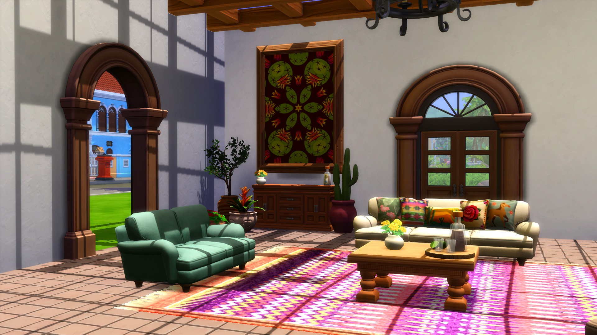 - Decorative: Cushions for the Sofa, Cushions, Beam, Three plants (including cactus), Painting, Dalia Flower, Rug, Tequila Bottle, Tequila Set and Mud Vase.