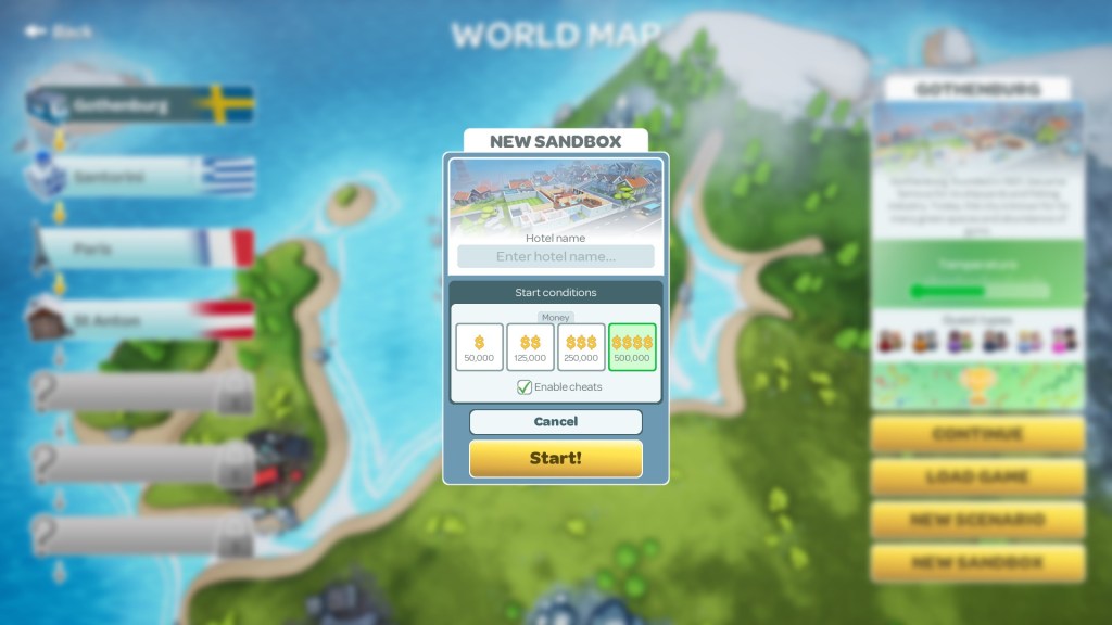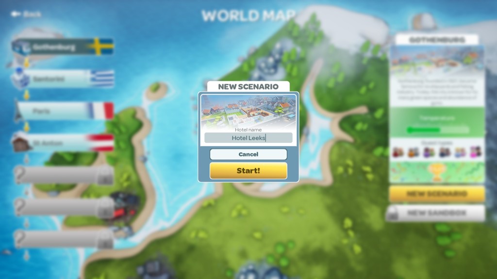 With that, I also completed the Gothenburg scenario. This opened up the option to play this location in Sandbox mode, but also to progress onto Santorini, which is the second scenario in the demo. I was also given the option to continue in my current hotel for the time being.
