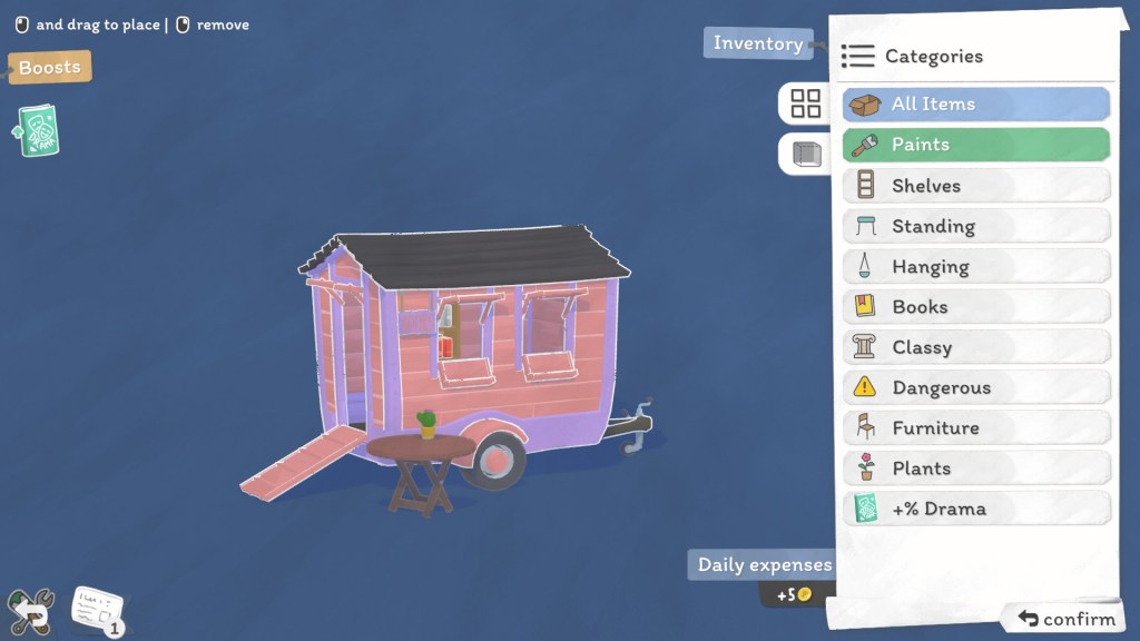 It’s important to note that some objects will add to your daily expenses, which are noted down at the bottom of the screen. It’s key to keep this in mind, especially when you take into consideration your daily location fees too!