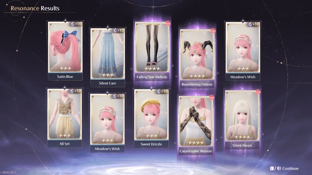 With just a few days left to go, I quickly looked at which of the limited time outfits I would be able to work towards completing with the time and currencies I had left. I focused mainly on Night Capricorn Song and Rewound Daydream. Both being four-star outfits but with pull rates more realistic for the 8,000 diamonds I had in my pocket. Now, I managed to fully complete both of these with diamonds to spare, mainly thanks to one very lucky pull where I received four items in one go!